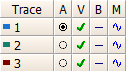 V: Stands for View. Left-click the individual check boxes in this column to hide/view individual traces. You can hide/view all traces by left-clicking on the V itself.