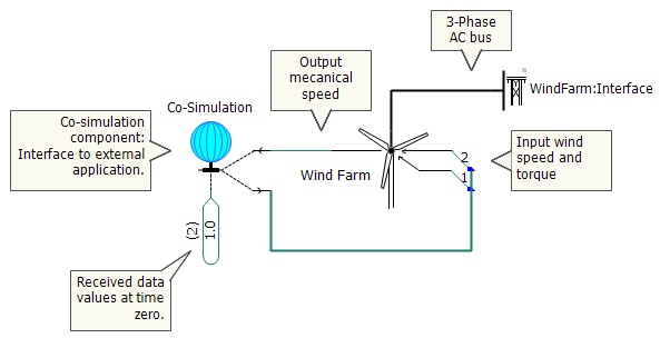 The co-simulation component is configured to accept and provide data to the PSCAD/EMTDC simulation, as well as to provide data required by the external application.