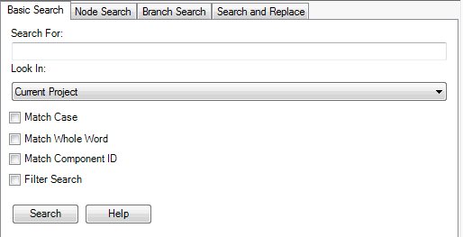 If the user wishes to search a project for a particular object, the search utility may be utilized. To invoke the Search dialog window, click on the View tab in the ribbon control bar and select Search from the Panes drop list, press the Search button in the Home tab in the ribbon control bar or press Ctrl + Shift + f on your keyboard.