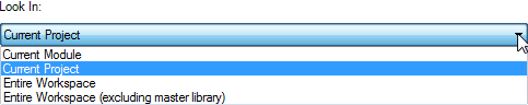 Look In: Select Current Project or Current Module. Current Project is selected by default, but you can narrow your search by confining it to the current module canvas (Current Module).