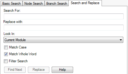 The search window is divided into three main parts: Basic, Node, Branch Search and Search and Replace.