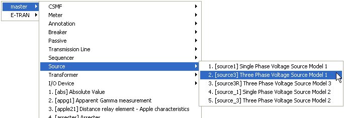 Library pop-up menus display the definition name, followed by whatever is entered into the description field of the definition. In the above image, the user has two library projects loaded in the workspace: The master library and another library called E-TRAN. The mouse pointer is pointing toward the Three Phase Voltage Source Model 1 component in the Source module, in the master library. A left-click on this component will select it, and another left-click will drop it onto whichever canvas is open in Schematic view.