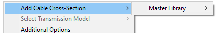Another way is to use the context menu. On the Schematic tab, move the mouse pointer over a blank area of the window. Right-click and select Add Cable Cross-Section. A sub-menu will appear containing a list of all loaded library projects. Each of these will contain a list of all cable components available in that particular library. Select a cable and it will be automatically added.