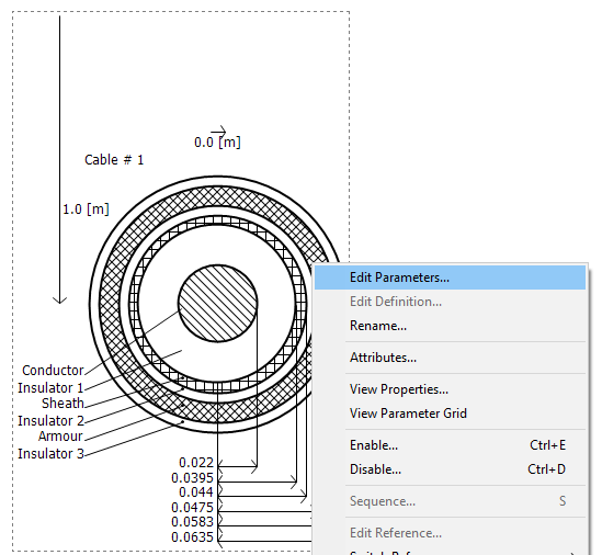 Cable cross-section parameters can be edited through the corresponding cross-section parameters dialog window. Right-click over the cross-section component (without selecting it) and select Edit Parameters... to access this dialog. See Editing Component or Module Parameters for more details.