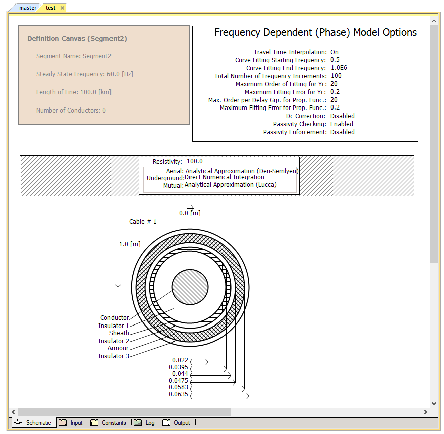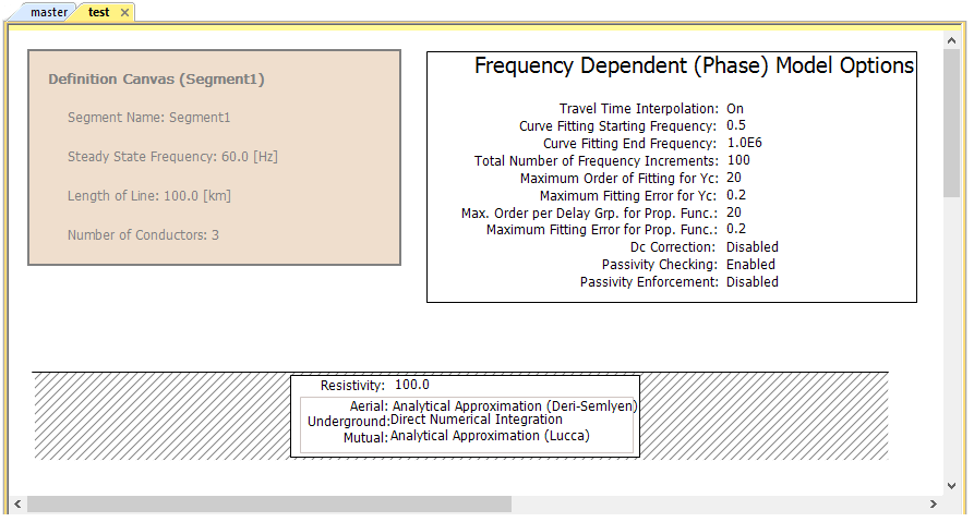 Frequency Dependent (Phase) Model Options: This component represents the transmission line model being used, and by default is the Frequency Dependent (Phase) model component. The parameters of this component may be edited by either a left double-click on the component (or right-click and select Edit Parameters...) to bring up the corresponding dialog window.