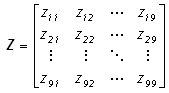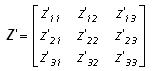Each sub-conductor is initially considered a separate entity when the system matrices are constructed. For example, if a transmission system consists of a single three-phase circuit, where each phase conductor consists of three sub-conductors (as shown in Figure 8-14), then the resulting system matrix dimensions would be 9 x 9, as shown below for the series impedance matrix Z (where the individual matrix elements are calculated as described in the section entitled Deriving the System Y and Z in this chapter).