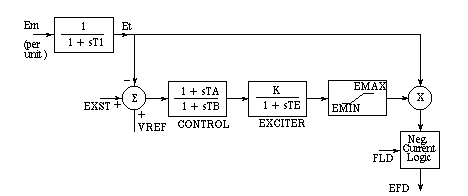 This exciter is based on an IEEE type SCRX solid state exciter. The output field voltage is varied by a control system to maintain the system voltage at Vref. Please note that this exciter model has no initialization capabilities - this means that it will respond to whatever inputs it receives regardless of the state of the machine model.