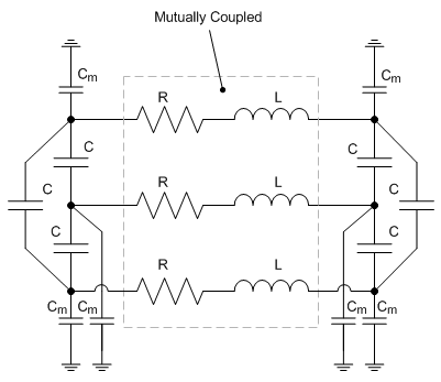 A p-section is formed by using lumped R, L and C elements, based on information entered by the user. The R and L elements are represented in matrix format and thereby provide coupling between the three phases. There is also both a mutual capacitance C and a capacitance to ground Cm at each end: