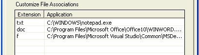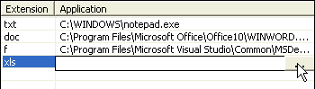 File associations are entered in two parts: The file extension (with no period), and the path to the application executable file.