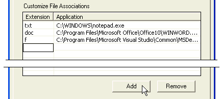 To enter a new file association, press the Add button. The next available input box in the Extension column will appear as selected.