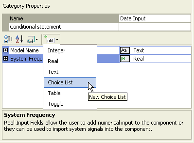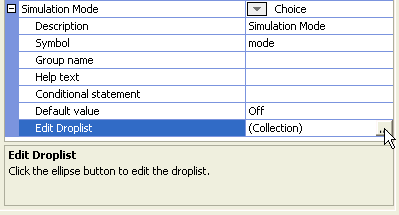 Choice lists are constructed using the Drop List Editor. To open the editor, left-click on the [+] box to expand the choice list tree node, select the Choice List field and then left-click the [...] button.
