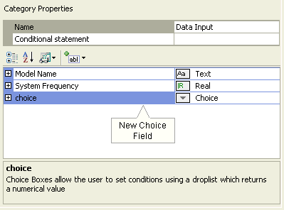 To add a new choice to a category page, select the category in the Categories tree and then select Choice within the Add Parameter Field drop list button in the tool bar: