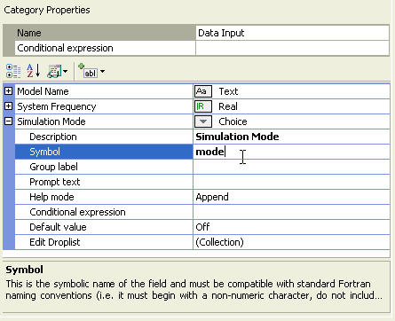 Symbol: Enter a symbolic name for the choice list, which will be used as a variable name when addressing this field within code. Note that this name must be compatible with standard Fortran naming conventions (i.e. it must begin with a non-numeric character, do not include spaces, etc.).