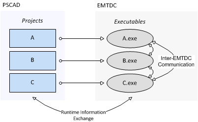 In terms of runtime information for plotting and online data signal control, PSCAD and EMTDC communicate normally as they would for a single process. There is additional communication between the multiple EMTDC processes in multi-project simulations however. Due to the fact that each EMTDC process is an executable file, each can be launched on its own processor core, enabling parallel simulation of the complete system.