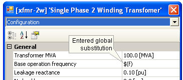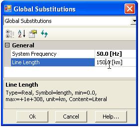 Existing global substitution values may be modified directly from the dialog. For example, say two substitutions to represent system frequency and transmission line length (called f and length) already exist. A user wants to set the system frequency globally as 50 Hz, and the transmission line length globally as 100 km in a project. This can be modified as follows in the global substitutions dialog: