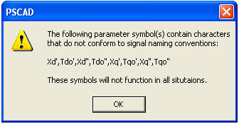 There is an assortment of characters that are not allowed as part of any XML content, as they are used by the language as delimiting characters. These characters were initially deprecated in PSCAD v4.0 (2003), but have been functioning in ‘compatibility mode’ until now. In previous versions, editing a component definition with input parameter Symbol names containing any of these characters would result in a similar dialog to the following: