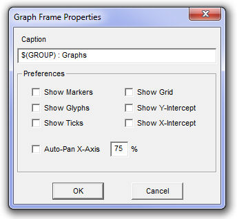 Caption: Enter a title for the graph frame (this text will appear in the graph frame title bar). The default text may appear a bit cryptic: The $(GROUP) syntax is used as a naming convention for grouping objects in the workspace. For more information on this syntax, see Grouping of Runtime Objects. The $(INSTANCE) syntax may be used to display the module name and instance number for ease in transferring to reports.