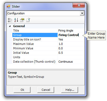 Creating a runtime group is straightforward: All that is required is that a group name be added to the object input parameter called Group. The image below shows the Group parameter in the Slider component parameters dialog.