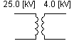 A user has created a single-phase, two-winding transformer component and wishes to display both the primary and secondary winding voltage ratings directly on the component graphic. The primary voltage rating input parameter Vprim is entered as 25.0 [kV] and the secondary input Vsec is set at 4.0 [kV] as shown below: