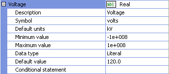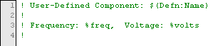 When the component is evaluated, the Symbol names (freq and volts) are given the value entered in their respective fields. In this case, freq = 60.0 and volts = 120.0. The user is free to insert these variables elsewhere within the component script by using the $ operator.
