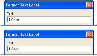Consider Example 10-5 above, but replace the $ operator with the % operator in the new text labels. When the component instance is now viewed on the Circuit canvas, values of the input parameters Vprim and Vsec will appear on the component graphic as follows:
