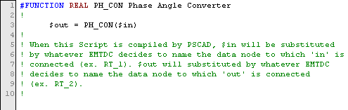 ! REAL PH_CON ! Phase Angle Converter REAL RT_1, RT_2 ! RT_2 = STOF(ISTOF + 2) ! EMTDC extracts port connection value ! from stored data array RT_1 = PH_CON(RT_2) ! |
