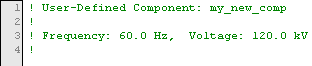 A user-defined component definition called my_new_comp has been programmed to display the contents of certain key input parameter fields, along with the definition name, within comments provided in the component Fortran segment, namely: Frequency with Symbol name freq, value 60.0 and units in Hz, and Voltage with Symbol name volts, value 120.0 and units in kV. Note that both freq and volts are local variables and so the local context short form is used.
