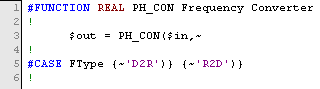 The function PH_CON is modified to include a second argument indicating the conversion type required, based on the state of Ptype. The additional argument is a character string, where D2R indicates degrees to radians conversion and R2D radians to degrees. Braces are used, along with a #CASE directive and ~ Line Continuation Operator: