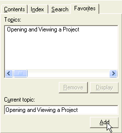 The Favorites section allows users to bookmark their favorite help pages. To add a favorite topic to the favorites list, simply left click the Add button. To remove a topic from Favorites, select it and left click the Remove button. To display a topic from the favorites list, select it and left click the Display button.